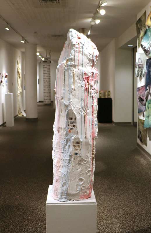 Dream Archetype Stele, 2017. 1′ x 1′ x 5′. Plaster, pigment, fake blood, secret. code.