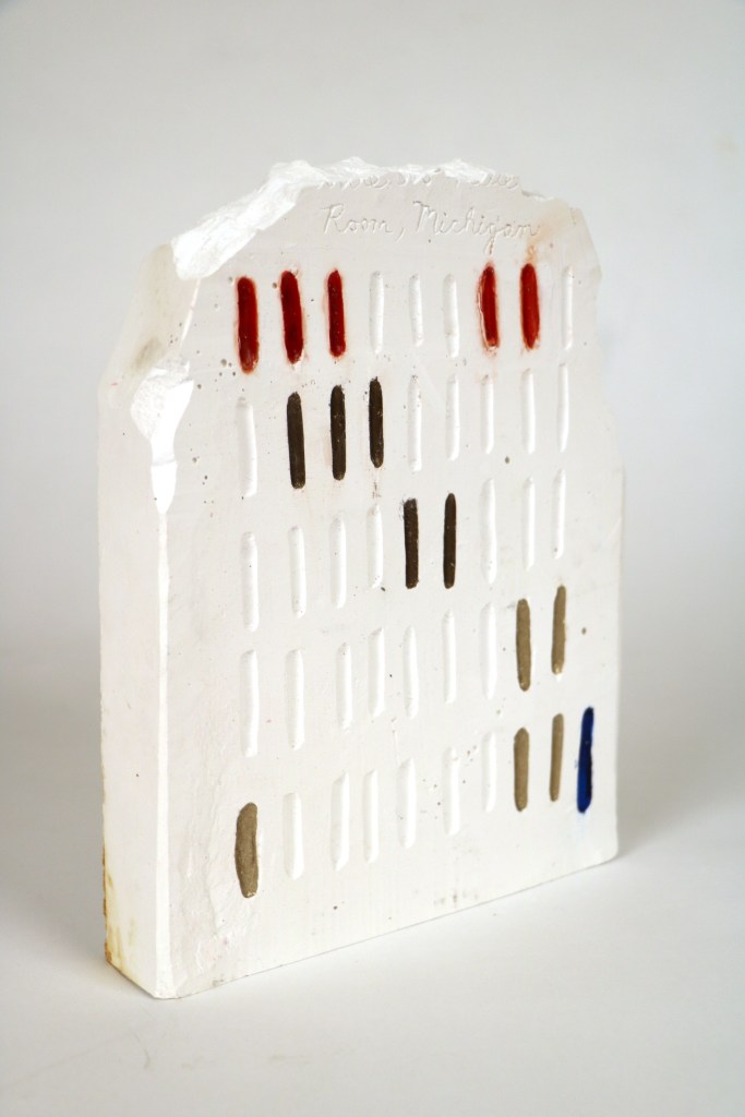 This large plaster sculpture was designed to resemble a stele, but instead of serving as a monument to ancient civilizations, it documents the settings of several recurring dreams I have. I created a code, the same code present in my previous map-making works, and gave the audience a purposefully miselading key, not meant to give them any real hints to decipher the map. The stele represents a breakdown between dream space and waking life, as well as a lapse in understanding of language and code.