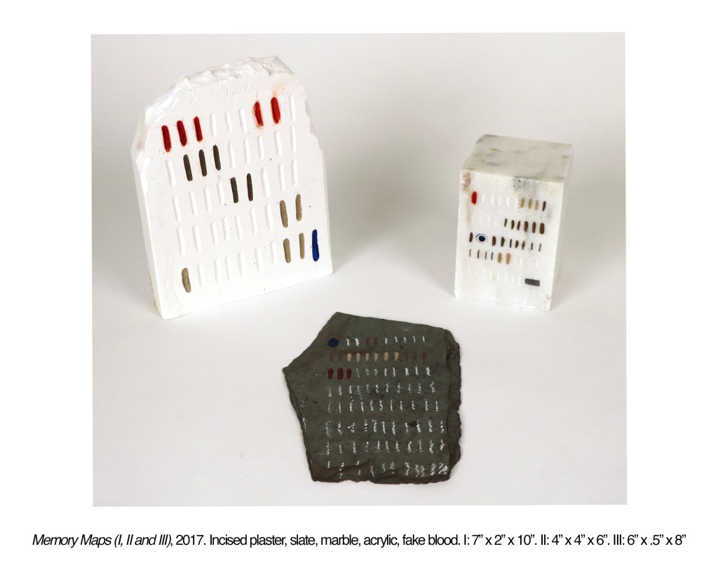 These three “memory maps” all reference real places of significance to me, but are recorded in a purposefully elusive code so as to avoid comprehension by anyone but the mapmaker. These sculptures play with language, history and monuments, calling into question what kinds of spaces are deemed worthy of recording, and who is allowed to access the path to get there.
